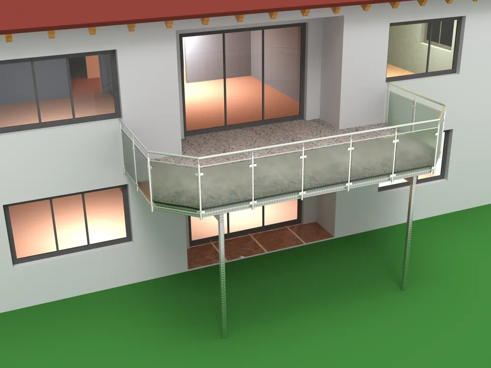 Die Konstruktion wird mit mindestens zwei Stützen errichtet und über Befestigungsanker an der Geschossdecke befestigt. Da keine tragende Verbindung zur Fassade notwendig ist, eignet sich diese Bauweise perfekt für Renovierungen und Neubauten.
