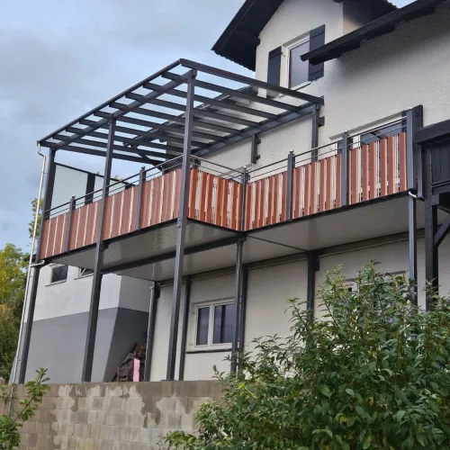 Möchten Sie Ihren Balkon auch bei leichtem Regen oder aufziehendem Gewitter bedenkenlos nutzen? Unsere Balkonüberdachung von Metallbau Geißler macht es möglich! Maßgeschneidert und flexibel anpassbar, bieten wir Überdachungen aus feuerverzinktem, pulverbeschichtetem Stahl kombiniert mit Glas oder Metalldächern – perfekt abgestimmt auf Ihr neues Balkongeländer.