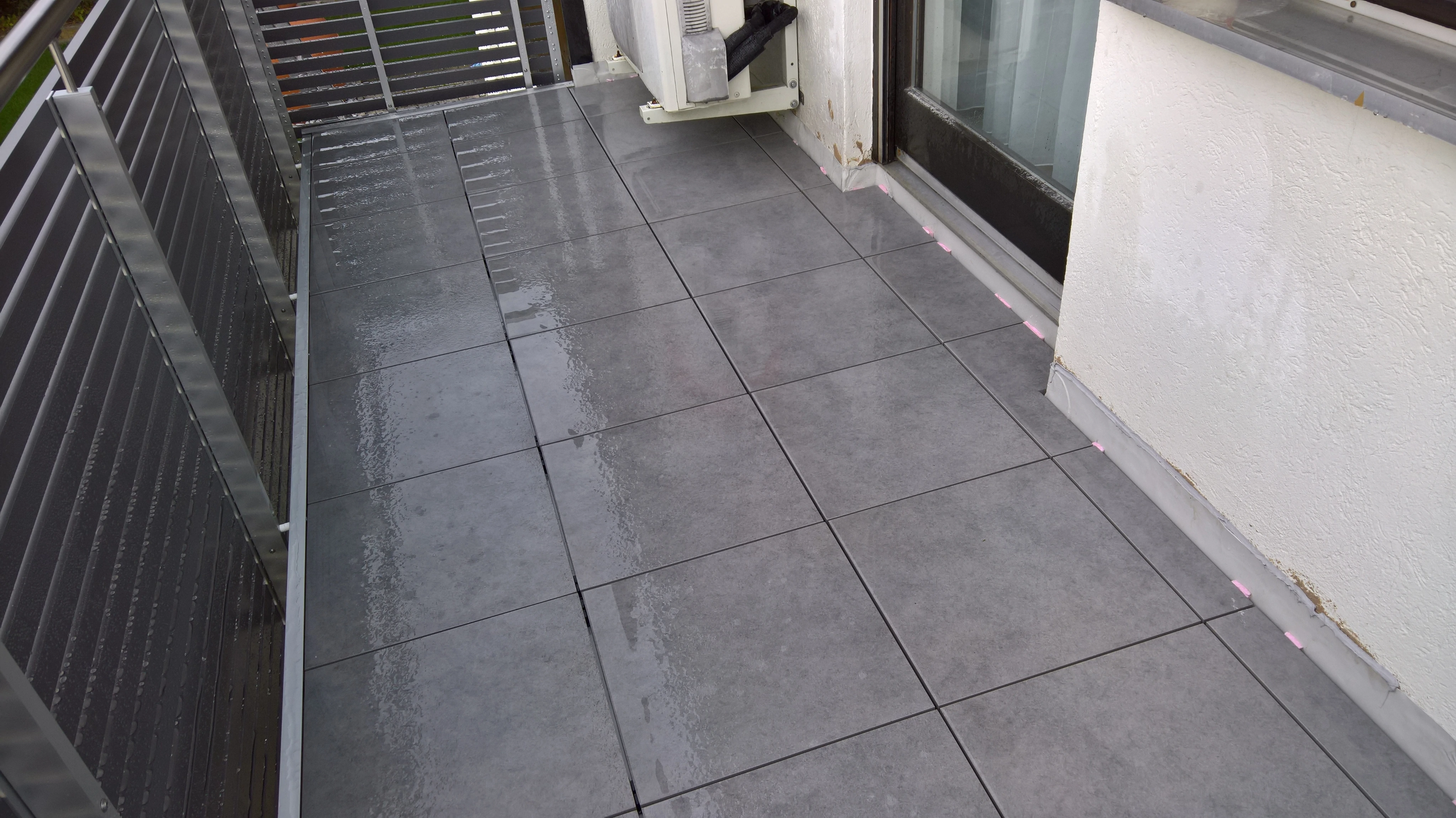Untergrund ist mit Gefälle hergestellt das Wasser kann auf der Fläche und auf der Belagsplatte ablaufen.